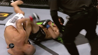Poirier is the ultimate example of an overwhelming mauler who just breaks opponents under a steady cascade of offense. He’s absolutely unruly in pressing on the feet with automatic fire and then seamlessly transitioning to submission attacks at contact range. Both of these gifs testify to Poirier’s merciless onslaught; the first against Grispi and the second (left) in his latest dismantling over Pablo Garza. Generally, a martial artist who is this fixated on pure offense pays the price defensively, but Poirier has been phenomenal in escaping precarious situations, such as the leg lock Garza threatened with early.
