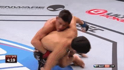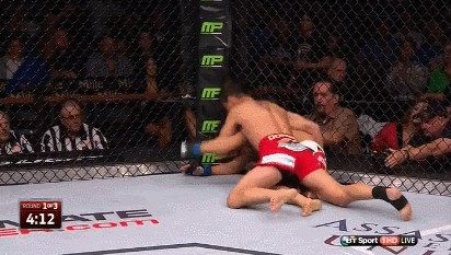 Of course, that’s the pure wrestling approach, and if you’ve read this far you already know that Cruz’s greatest strength is not in his grappling or his striking, but in the way he blends the two together. Why engage Mizugaki in a pure grappling match when a few precise punches could accomplish the same goal, and accumulate damage in the process? With that in mind, Cruz allows Mizugaki to post, and simply hammers him in the face with his fist. At this point Mizugaki has two choices: continue to struggle to his feet while being punched in the side of the head, or relinquish what little upward progress his posted arm has given him and turtle to protect himself from Cruz’s devastating blows.