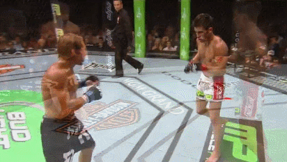 For our purposes today, I’m more interested in analyzing his brilliant set-up. Ordinarily it would be inadvisable for a fighter to fall forward on a cross the way Cruz does in frames 3 and 4. Lunging at his foe, Cruz overextends himself and needs to bring his right foot forward to catch himself. Essentially, he momentarily loses balance and compromises his stance, giving Mizugaki a viable opportunity to counter and catch him in a vulnerable position, something that has happened to him in the past (GIF).