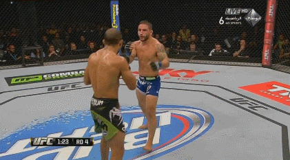 As it happens, Chad Mendes is actually a very good boxer when he wants to be. With his confidence shaken earlier in the fight, he had often turned to flashy, dancing movements and lunging, off-rhythm punches–more hallmarks of his stablemate TJ Dillashaw than cohesive parts of his own style (GIF). With renewed vigor to start the fourth round, however, Mendes found his most consistent success with nothing more than an educated left hand.