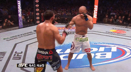 Robbie Lawler is an incredibly unpredictable fighter, even without his dangerous kicks and knee strikes. Pawing at his opponent with half-speed punches, Lawler makes it unbelievably difficult to time his punches. It all comes down to rhythm. It’s hard to capture in still frames alone, so make sure you watch the GIF of this next sequence.