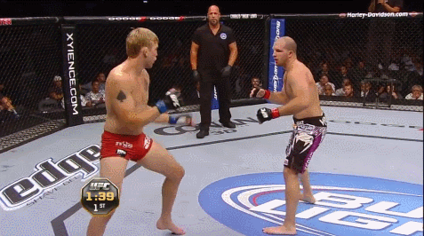 It doesn’t take a great striker to manipulate the distance this way, either. For years wrestlers have been ducking their heads and bombing taller, better strikers with knockout punches. Even Matt Hammil, no great striker, was able to lay his hands on the Swede’s chin by playing with level changes and drawing the Mauler’s eye away from the threat (GIF).
