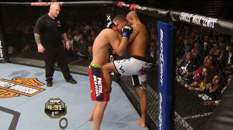 6. Undeterred, Diaz throws another knee, this one to Penn’s thigh.