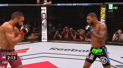 Johnson attacks first, and counters last, the product of an ingrained focus on constant aggression. By leading, he immediately forces Barboza onto the reactive. Make no mistake: Barboza is a competent counter fighter, a fact of which Johnson was reminded throughout the fight. But he rarely sets up his counters, relying instead on tremendous speed and reflexes. So Johnson was free to lead the dance himself, either with feints, as in the last sequence, or with punches, as in this one. When Barboza fought back, as he always does, Johnson fought back too, and made sure to always be the last one punching.