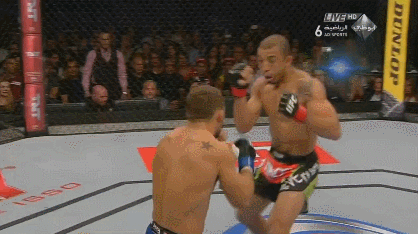 Still, this is not enough to invalidate the high guard. Not at all. Indeed, the forearms, elbows, and shoulders are every bit as important as the gloves when it comes to blocking. A small adjustment is often enough to render the little gloves a non-issue. All a fighter needs to do is turn his shoulders or draw his hand toward the back of the head–some call it “answering the phone” or “combing the hair”–and the side of his head is effectively covered. Even bare-knuckle boxers manage to make the high guard work using these subtle maneuvers. If you want to see it done well in MMA, just take a look at the beautiful trigger counter with which Chad Mendes knocked down Jose Aldo in 2014 (GIF).